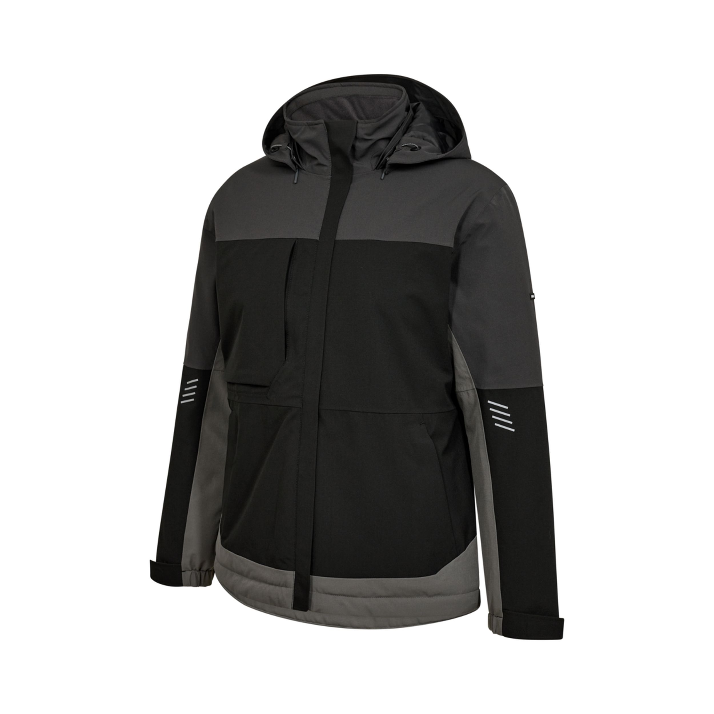 Die gesteppte Wattierung sorgt für angenehme Wärmeisolierung, ohne die Bewegungsfreiheit einzuschränken. Ein weicher, winddichter Innenkragen sowie eine abnehmbare, verstellbare Kapuze bieten zusätzlichen Schutz vor Kälte. Der verdeckte Frontreißverschluss mit Abdeckleiste verhindert unangenehme Druckstellen und schützt vor Wind. Durchdachte Details wie eine verschließbare Brusttasche, zwei Seitentaschen mit Reißverschluss, eine Innentasche und eine große Innentasche mit Klett bieten viel Stauraum für Werkzeuge, Ausweise oder persönliche Gegenstände. Die Ärmelabschlüsse lassen sich mit Klett regulieren, während ein elastischer Bund und ein verstellbarer Saum mit Kordelzug für einen körpernahen Sitz sorgen.