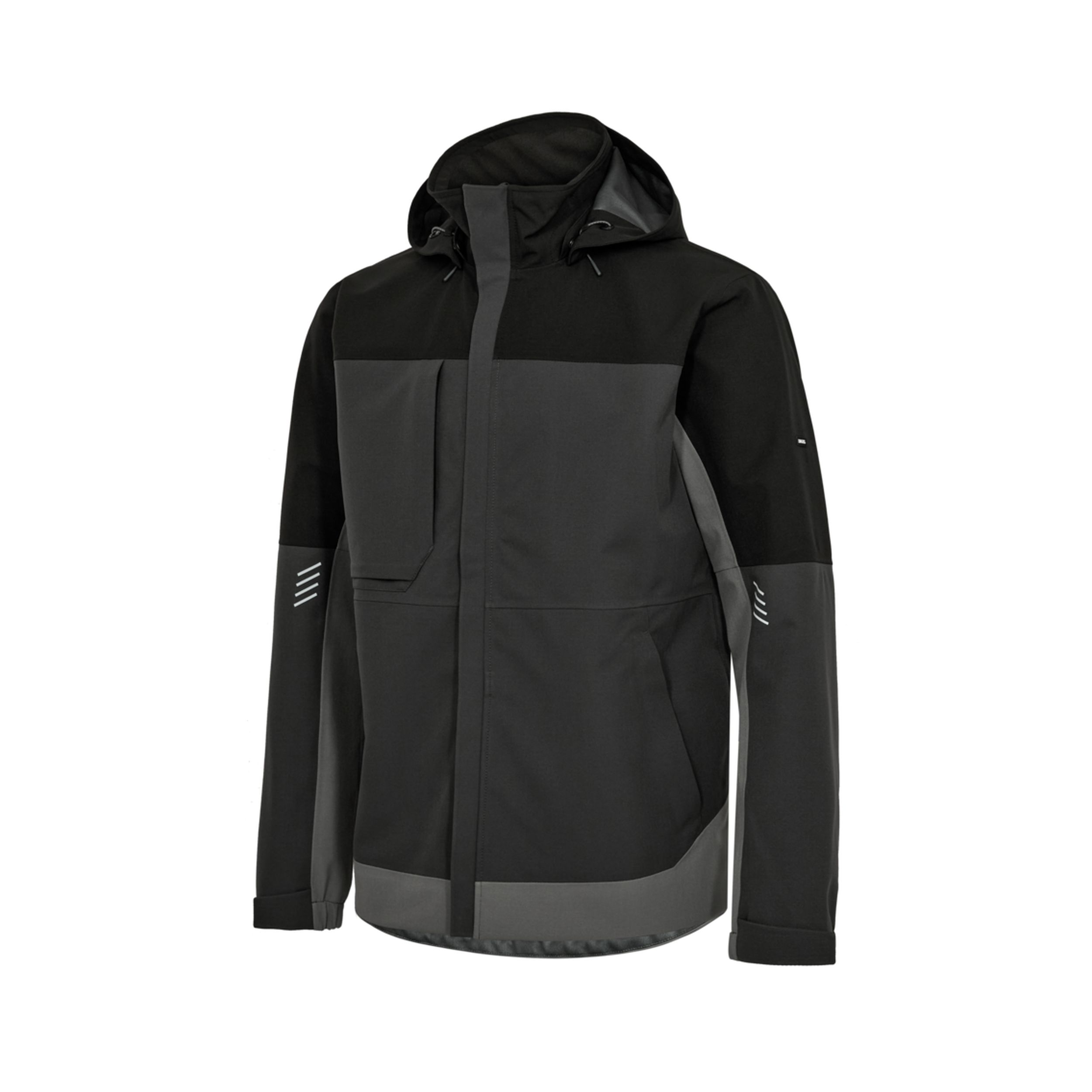 Der Schnitt mit weichem, windabweisendem Innenkragen und einer abnehmbaren, verstellbaren Kapuze gibt Sicherheit und Flexibilität bei wechselnden Witterungsbedingungen. Der verdeckte Frontreißverschluss mit schmaler Leiste minimiert Kratzrisiken an Arbeitsflächen und sorgt für ein sauberes, professionelles Erscheinungsbild. Für praktischen Nutzen sorgt ein durchdachtes Taschenkonzept: Eine geräumige Brusttasche mit Reißverschluss, zwei Seitentaschen und eine große Innentasche bieten sicheren Stauraum für Werkzeuge, Smartphone oder persönliche Gegenstände; ein D‑Ring erleichtert das Befestigen von Ausweisen oder Schlüsseln. Elastische Ärmelabschlüsse mit Klett und ein verstellbarer Saum gewährleisten optimalen Sitz, der verlängerte Rückenbereich schützt den Lendenbereich bei Bücken oder Heben.