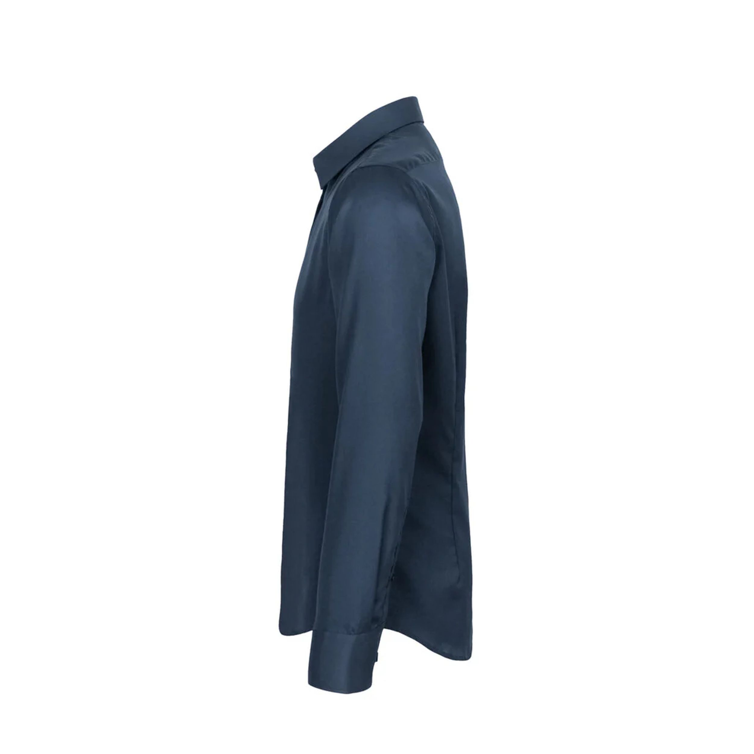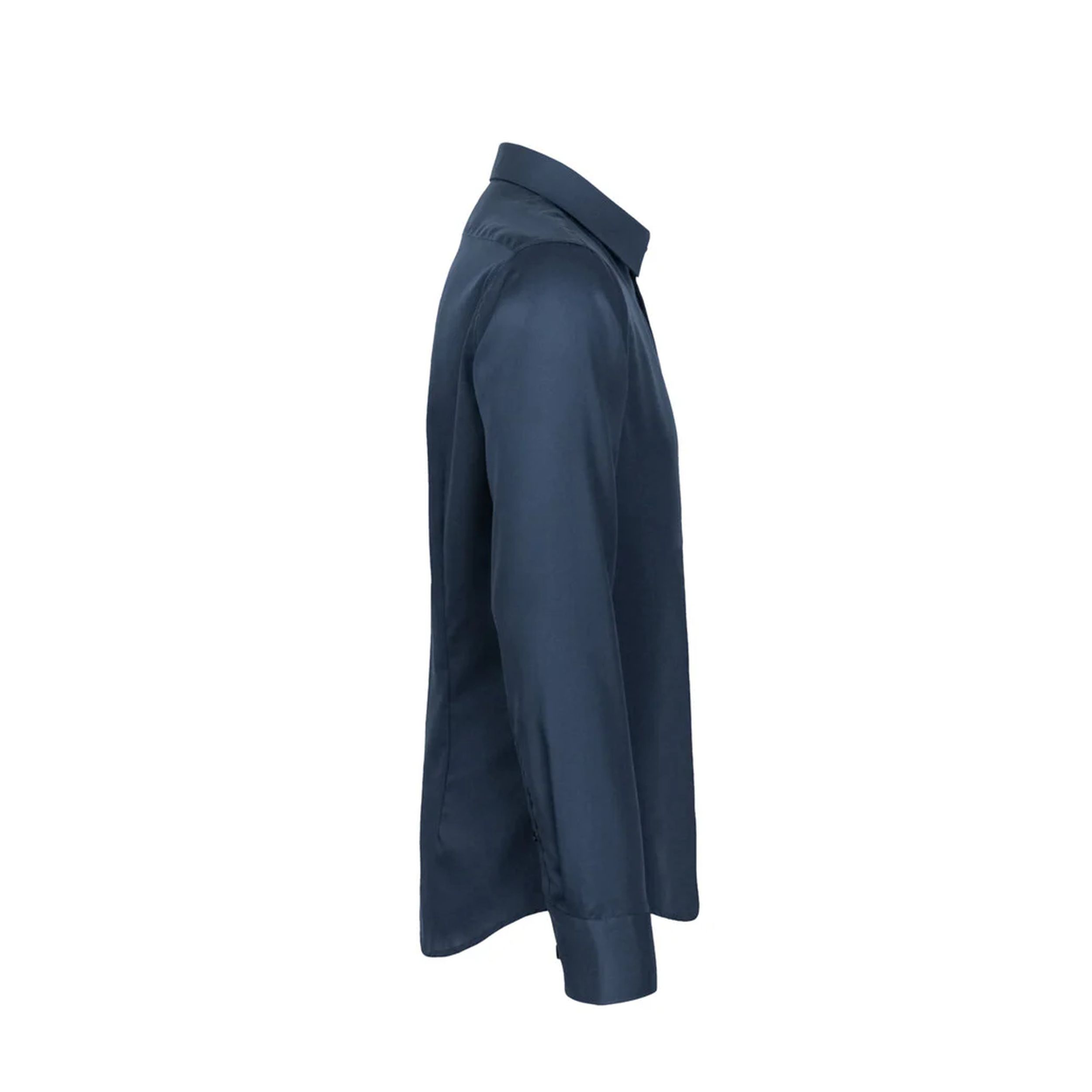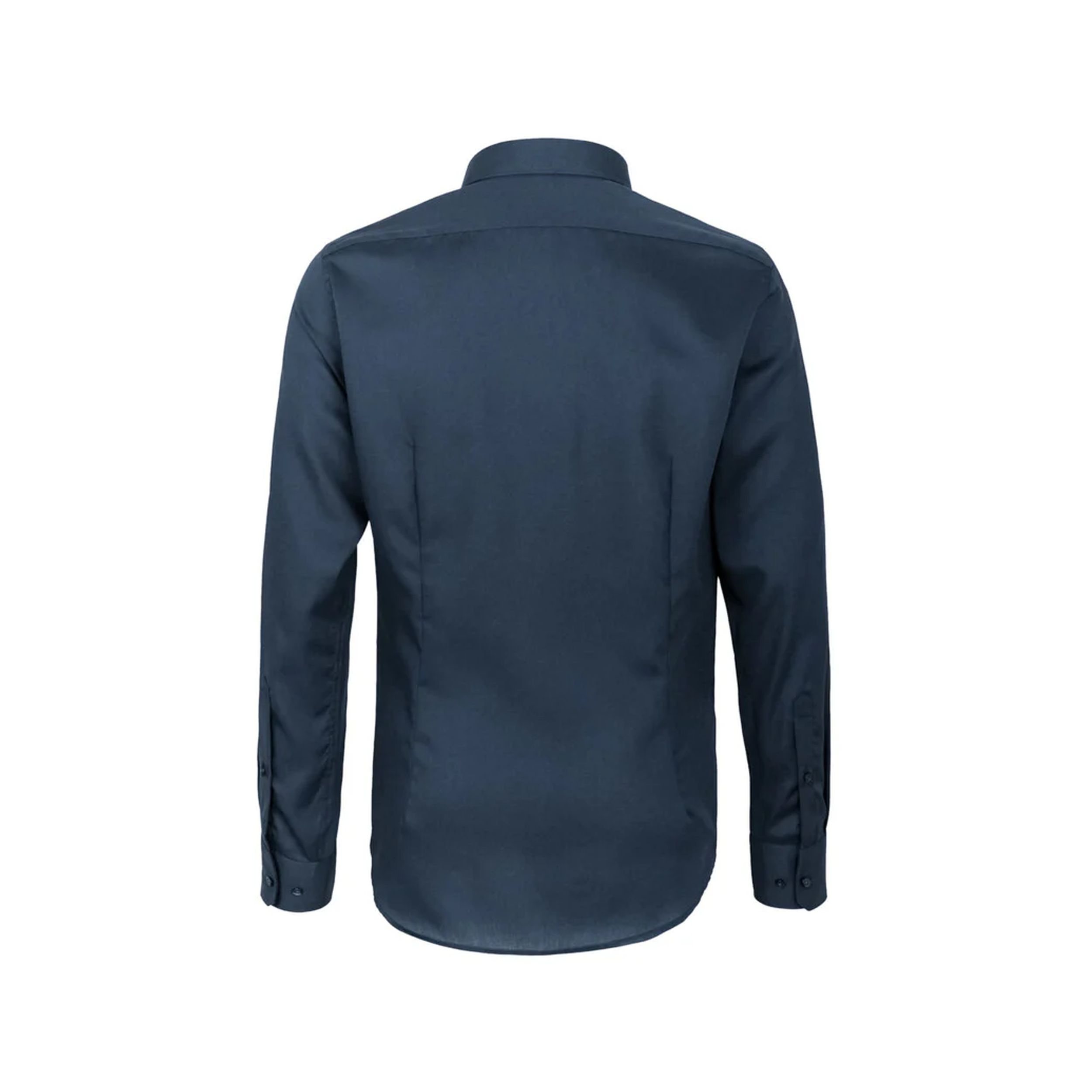 Die Passform im Regular Fit wird durch Abnäher im Rückenteil leicht tailliert, was eine moderne Optik mit uneingeschränkter Bewegungsfreiheit kombiniert. Die hochwertige Verarbeitung zeigt sich in Details wie der doppelten Schulterpasse, den Doppelkappnähten an den Seitennähten sowie den eingearbeiteten Kragenstäbchen, die für einen dauerhaft perfekten Sitz des Kent-Kragens sorgen. Ein dezenter Blickfang ist die Paspel aus dunkelblauem Satin an der inneren Kragennaht.