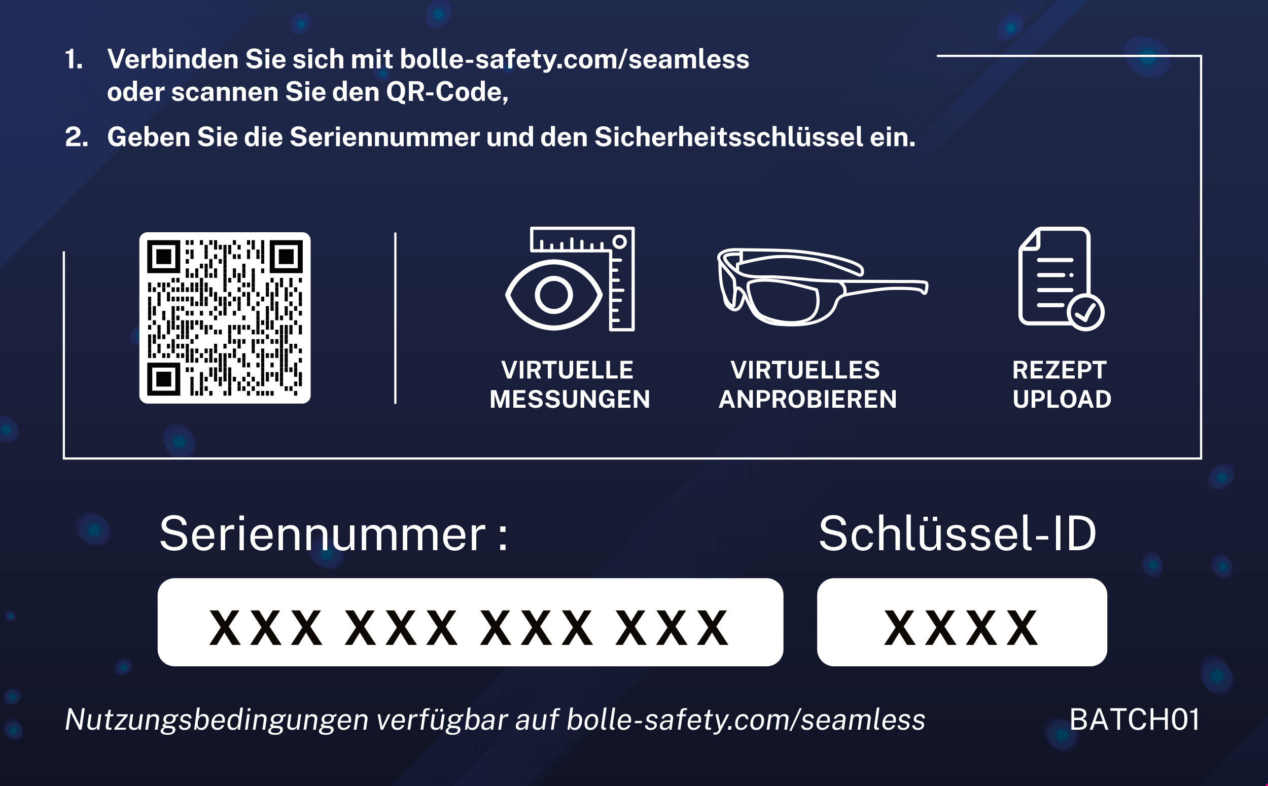 - Gutschein für die Online-Plattform SEAMLESS VISION zur virtuellen Auswahl einer maßgeschneiderten Korrektionsschutzbrille, verschiedene Modelle und Linsensorten zur Auswahl, präzise PD-Messung dank fortschrittlicher Technologie (KI). Zuverlässig für alle Arten von Korrekturen, einschließlich Einstärken- und Gleitsichtgläsern, direkter Zugang zu internen Bolle Safety Optikern, die bereit sind, alle Fragen zu beantworten, maximale Stärkenbereiche (abhängig von der Fassung): -12/+10, Zyl 5, Add 0,75 bis 3,5.