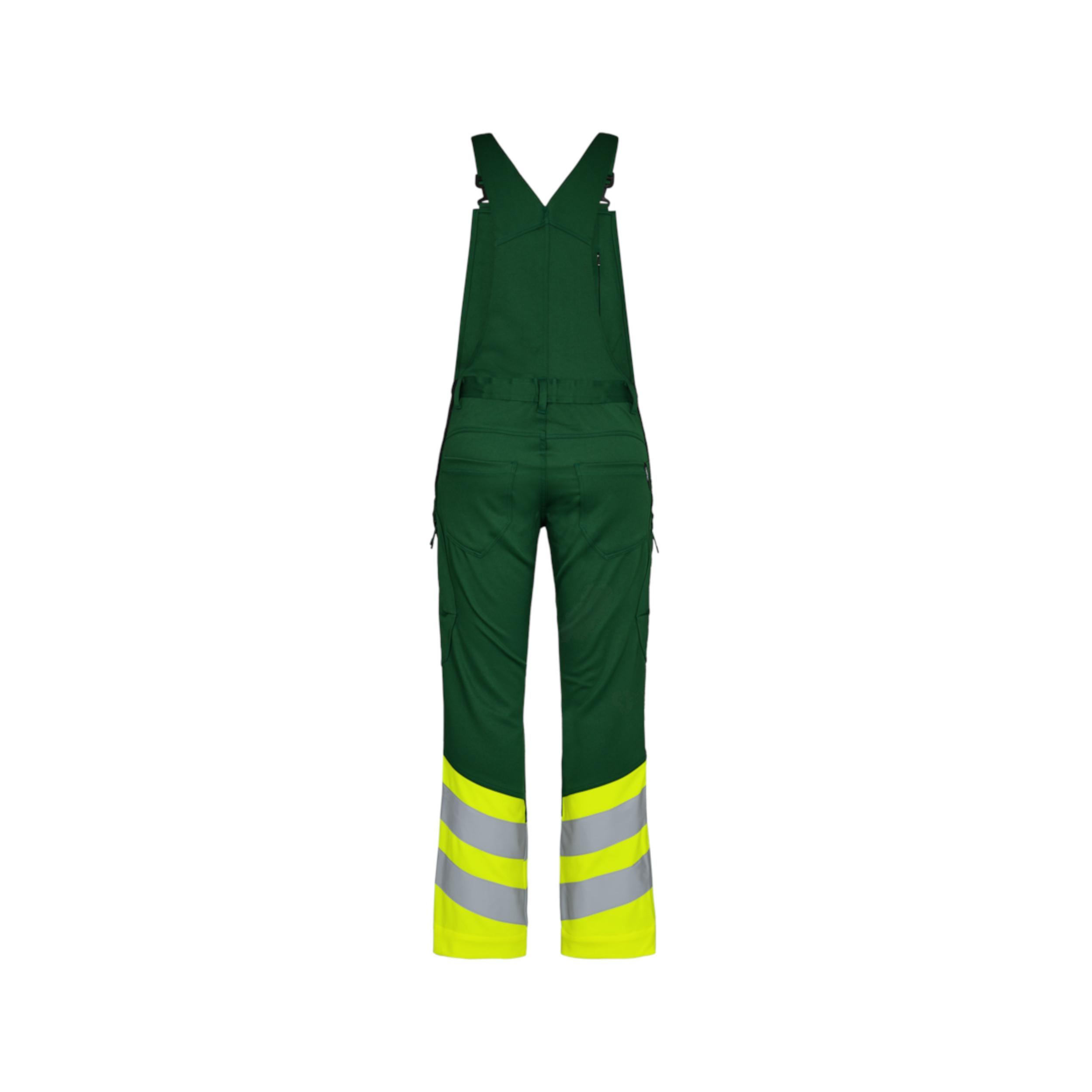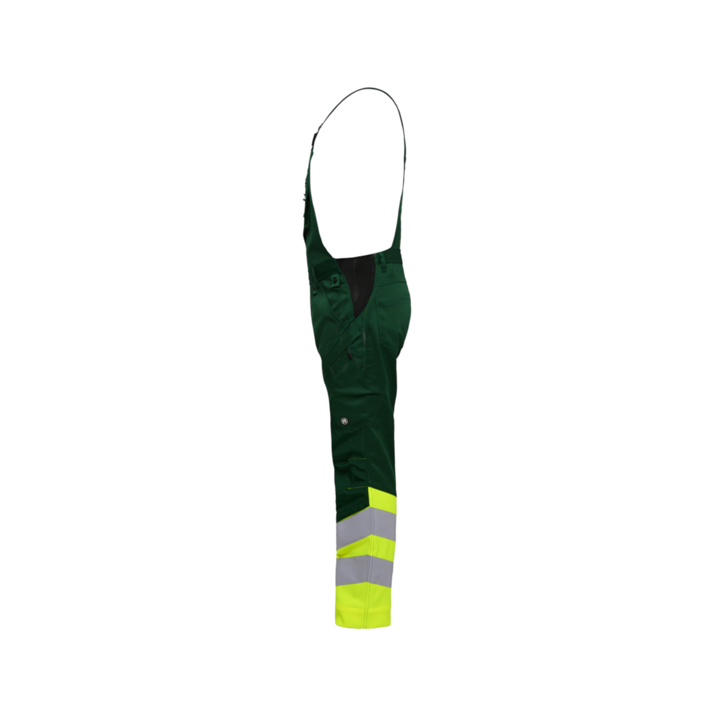 Das fluoreszierende Gewebe ist in verschiedenen Farbvarianten wie HiVis-Gelb, HiVis-Orange oder HiVis-Rot erhältlich, kombiniert mit Kontrastfarben wie Grün, Marine oder Schwarz. Reflektierende Streifen nach EN ISO 20471 (Klasse 1–2, abhängig vom Modell) gewährleisten eine hohe Sichtbarkeit bei Tag, Dämmerung und Dunkelheit. Zusätzlich erfüllt die Hose die Anforderungen nach EN ISO 13688. Die Latzhose überzeugt mit einem ergonomischen Schnitt, verstellbaren Trägern und elastischen Einsätzen für optimalen Sitz. Zahlreiche praktische Taschenlösungen – darunter Brusttasche, Schenkeltaschen, Gesäßtaschen mit Patte, Zollstocktasche und Vordertaschen – bieten Platz für Werkzeuge und Arbeitsutensilien. Belastungspunkte sind verstärkt, was die Lebensdauer deutlich verlängert.