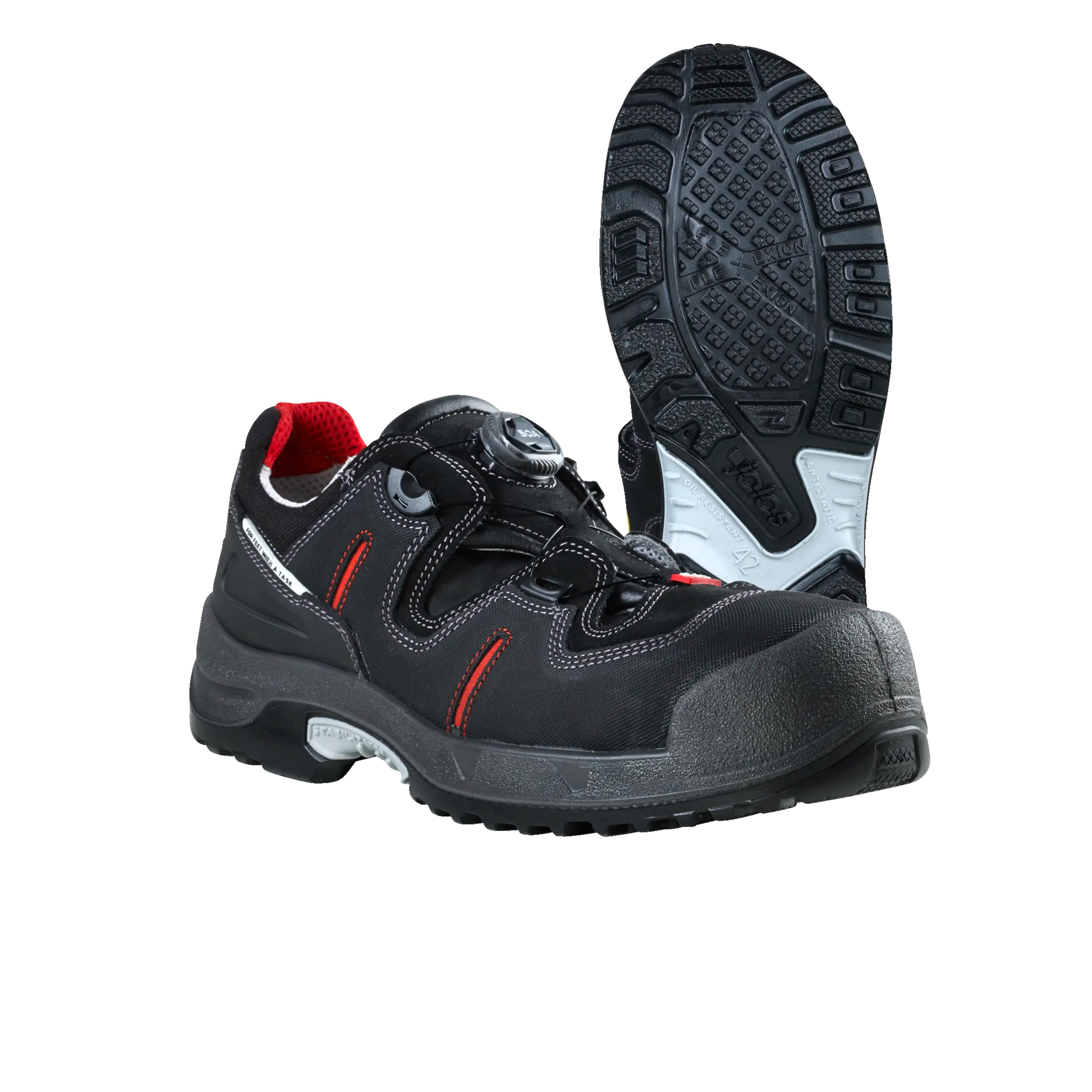 Eine Aluminiumkappe schützt die Zehen, während der durchtrittsichere Kompositkern die Fußsohle vor spitzen Gegenständen bewahrt. Die Sohle aus reaktivem PU bietet besten Halt auf glatten Untergründen und entspricht der Rutschhemmungsklasse SRC. Zertifiziert ist die Sandale nach EN ISO 20345:2011 in der Schutzklasse S1P, wodurch sie antistatisch wirkt, einen geschlossenen Fersenbereich sowie eine energieabsorbierende Ferse besitzt und vor Durchtritt schützt. Das innovative BOA®-Verschlusssystem ermöglicht ein schnelles, präzises Anpassen mit nur einem Handgriff. Die JALAS® 1708 eignet sich ideal für Innenbereiche wie Werkstätten, Lager oder Produktionsstätten, in denen Atmungsaktivität, Komfort und Sicherheit gleichermaßen gefragt sind.