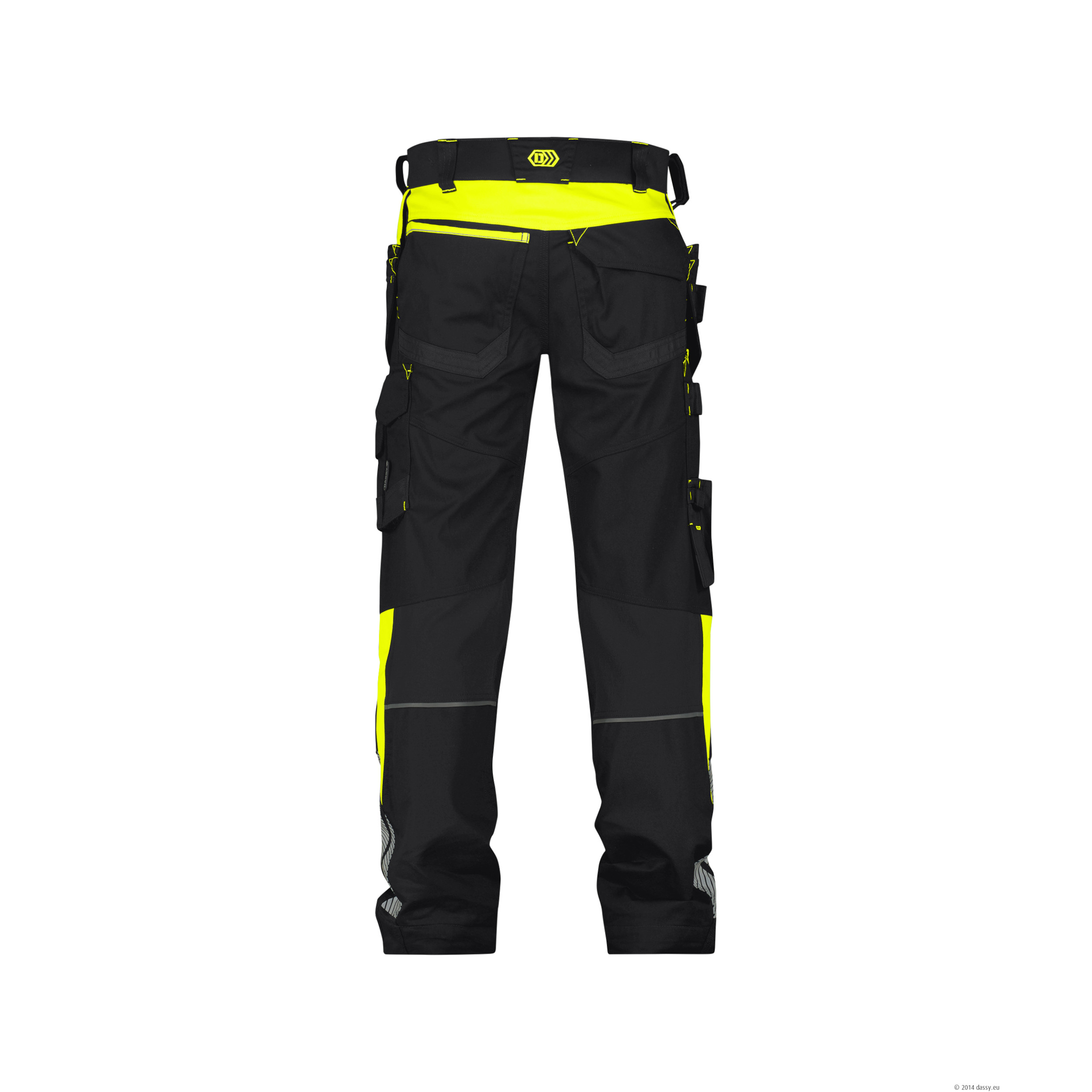 Die Hose ist mit besonders widerstandsfähigen Cordura®-Verstärkungen an Holster- und Kniepolstertaschen ausgestattet. Diese sind in der Höhe verstellbar und geeignet für zertifizierte Knieschoner gemäß EN 14404:2004+A1:2010 in Kombination mit den DASSY® FIDES Knieschützern. Mit zahlreichen funktionellen Taschen wie Schubtaschen, Gesäßtaschen (eine mit Patte), Schenkeltasche, Zollstock- und Cuttertasche, Stiftefach, Handytasche, offenen Holstertaschen mit Werkzeugschlaufen und abnehmbarem Ausweishalter ist für beste Organisation gesorgt. Reflektierende Details und fluoreszierende Riegel verbessern die Sichtbarkeit im Arbeitsumfeld. Der tiefer geschnittene Bund und die verstellbare Rückenelastik sorgen für optimalen Sitz und Flexibilität.