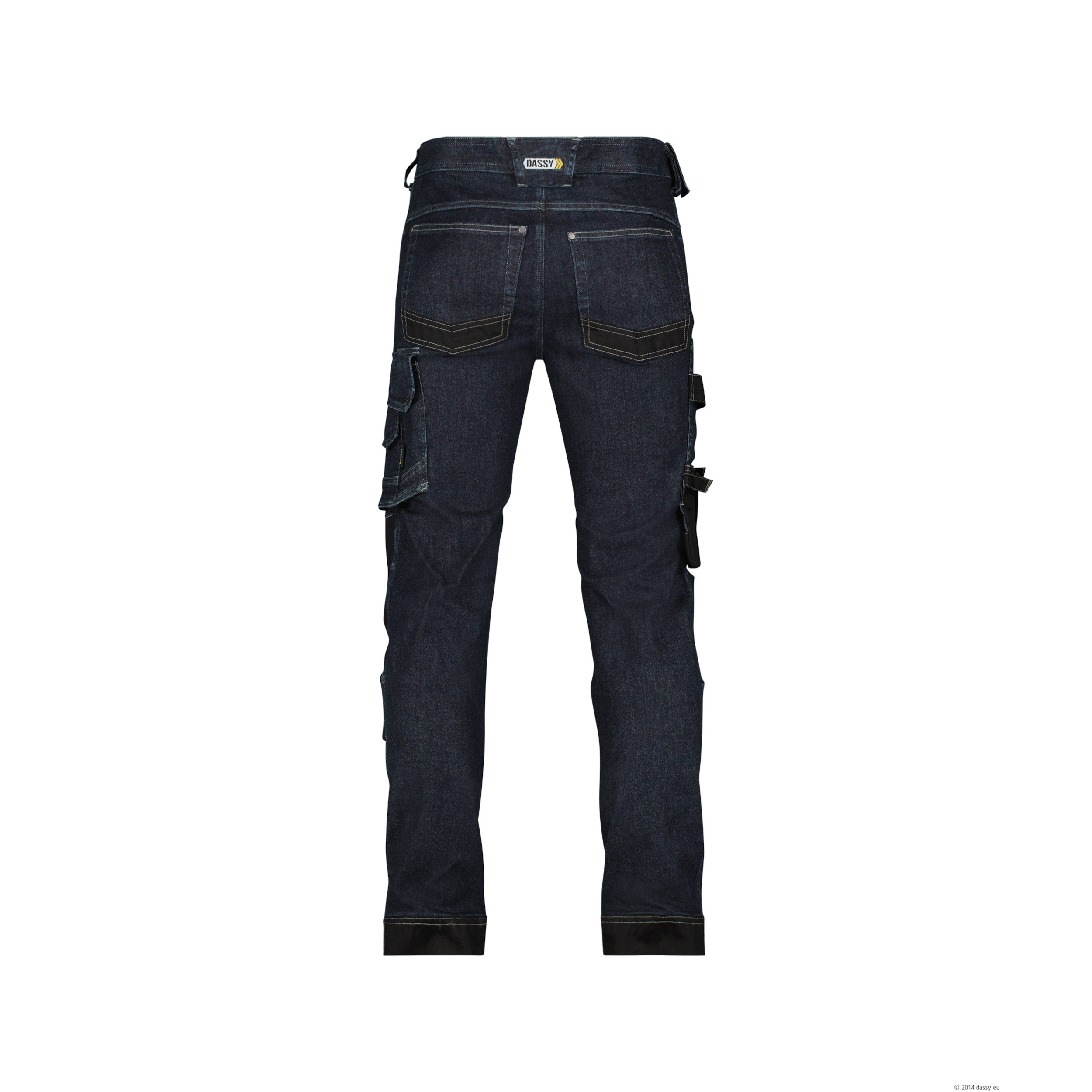 Verschleißgefährdete Bereiche sind mit Cordura® verstärkt – besonders in den verstellbaren Kniepolstertaschen, die mit Cordura®‑Stretch ausgeführt sind und gemäß EN 14404:2004+A1:2010 zertifizierbar mit DASSY CRATOS Knieschützern kombiniert werden können. Zur Ausstattung zählen neben klassischen Schubtaschen und Gesäßtaschen praktische Extras wie eine Schenkeltasche, ein Stifte- und ein Zollstockfach, eine Cuttertasche, ein Knopf für einen Messerhalter, ein D-Ring, eine Handytasche sowie ein abnehmbarer Ausweishalter. Die dreifachen Kappnähte, der Jeansknopf und der stabile Reißverschluss unterstreichen die hochwertige Verarbeitung.