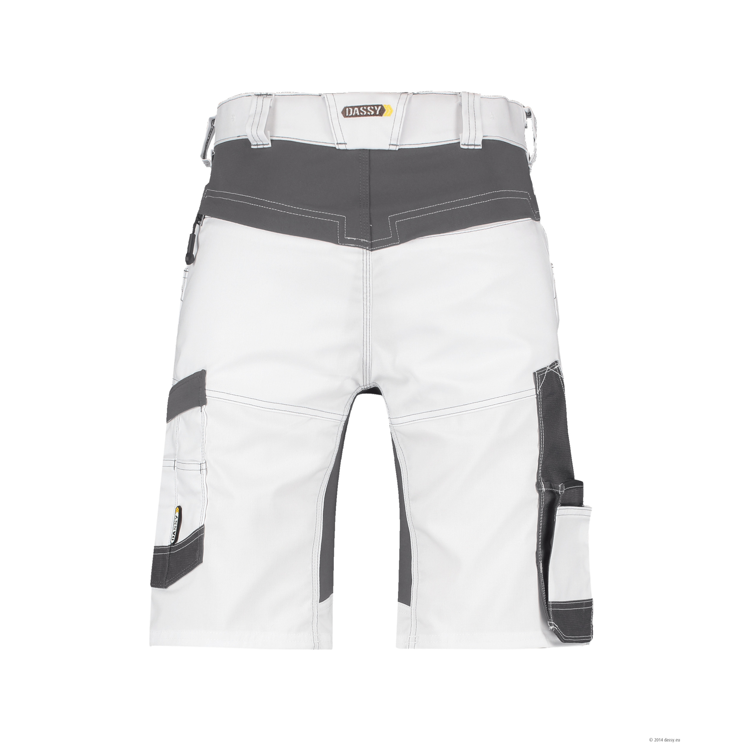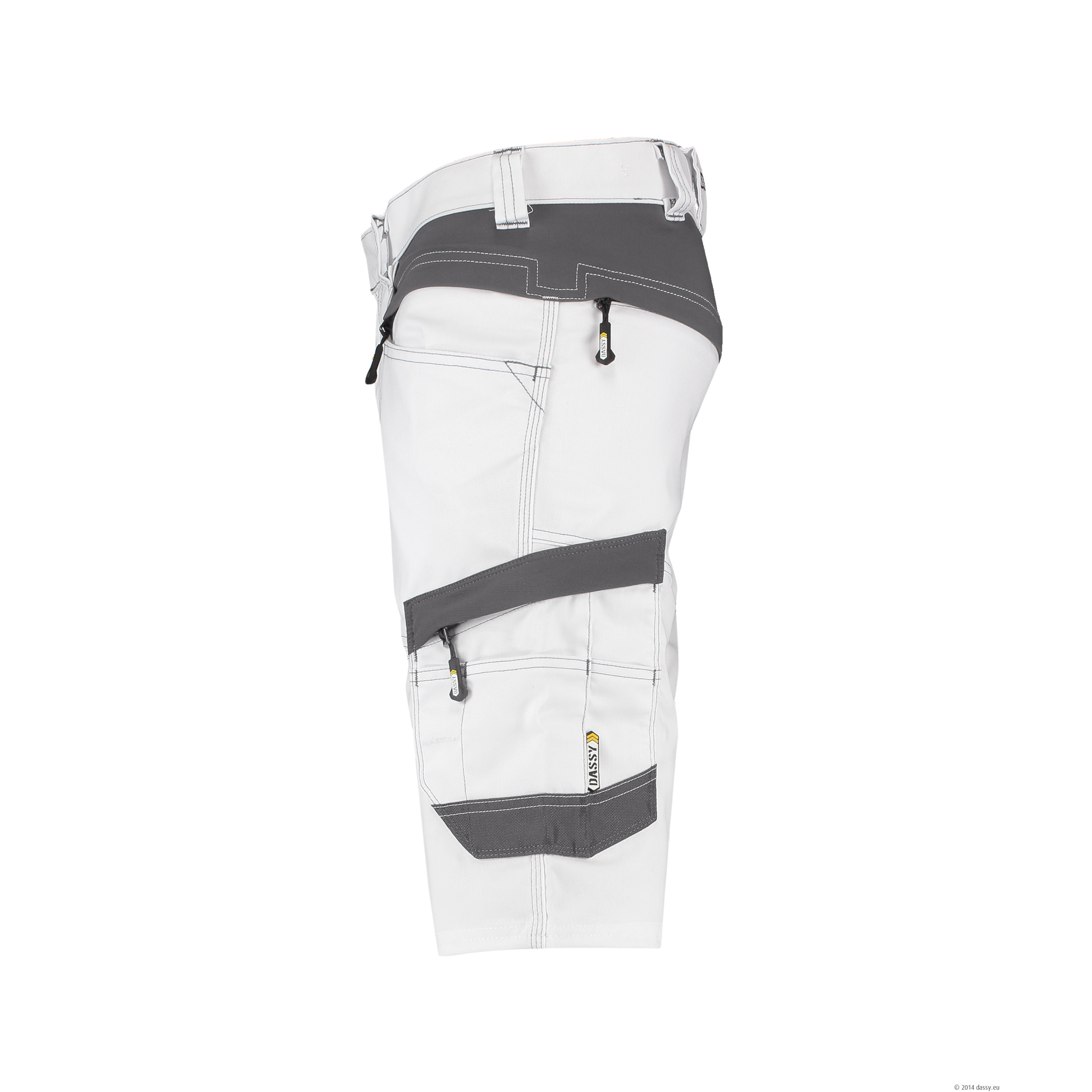 Die Materialzusammensetzung besteht aus 62 % Polyester, 33 % Baumwolle und 5 % Elasthan (± 260 g/m²), ergänzt durch Verstärkungen aus 88 % Polyamid und 12 % Elasthan. Die Shorts erfüllen die EN ISO 13688:2013 und bieten zahlreiche praxisgerechte Taschenlösungen, darunter eine integrierte Schenkeltasche, Werkzeugschlaufen, Pinsel- und Cuttertasche sowie eine spezielle Handytasche mit Reißverschluss. Erhältlich ist die DASSY® Axis Painters Shorts in klassischem Weiß mit grauen Kontrastelementen – optimal kombinierbar mit weiterer Malerbekleidung.