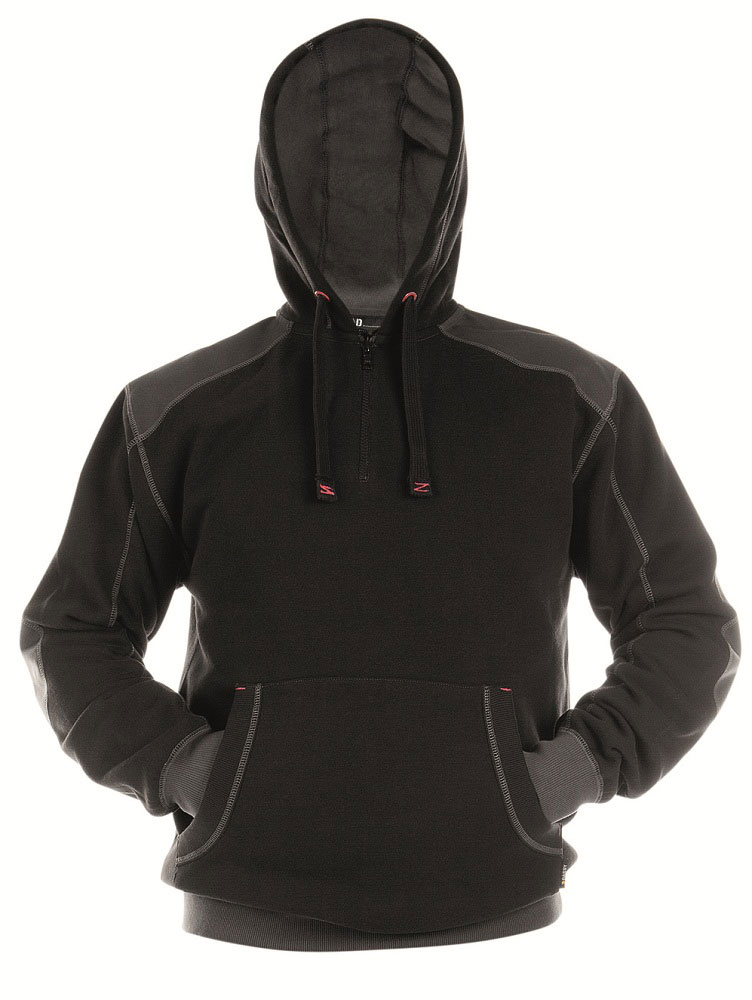 Eine praktische Kängurutasche, die doppellagige Kapuze mit Kordelzug sowie der kurze Reißverschluss am Hals sorgen für Funktionalität und Tragekomfort bei wechselnden Witterungsbedingungen. Strickbündchen an Ärmeln und Bund gewährleisten eine optimale Passform und verhindern das Eindringen von Kälte. Die dezente Kontraststickerei rundet das Design ab und macht das Modell besonders geeignet für die individuelle Veredelung mit Firmenlogos.